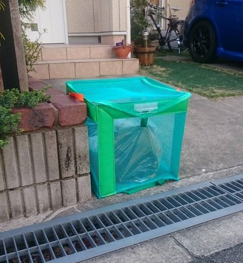 ◎ 市の担当者に問い合わせてみると、「ストッカーはOK!ゴミが入っていると分かる張り紙をして下さい」との返答でした。一応底に防虫剤と、飛ばされないよう重りのレンガをいれています。